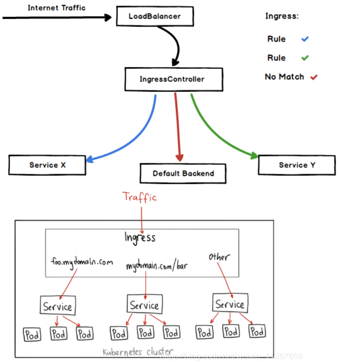 k8s标准,需要配置Ingress Controller服务(一个pod服务),例如nginx ingress controller,类似负载均衡,封装了一个