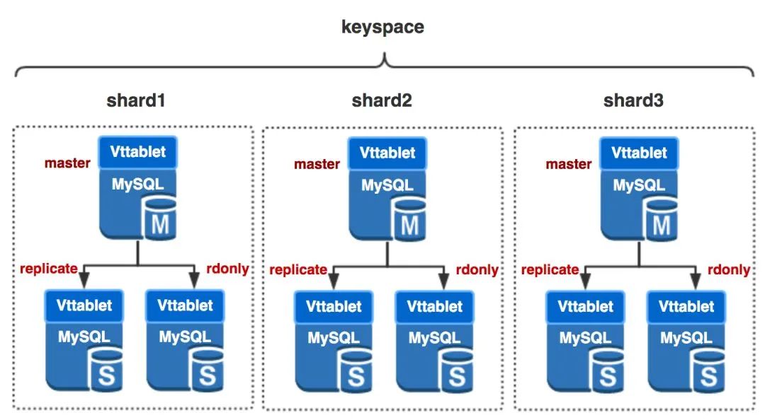 从上面可以看出一个KeySpace可以跨越多个Mysql实例,而且每个Shard中的数据都是KeySpace中的一个数据子集,一个KeySpace由分散在各个Shard中的数据子集组成。每个Shard在物理硬件上由多个MySQL实例和Tablet实例组成,一个shard具体包括:一个Master Mysql实例、一个Replica MySQL实例、一个ReadOnly MySQL实例和三个Tablet实例。选择作为分片键的字段值应尽量唯一;