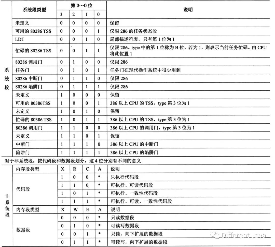 段界限:段界限由低32位中的0~15位和高32位中的16~19位构成(共20位),段界限表示段边界最大或者最小扩展到的大小,段只能向上或向下扩展,段界限用来限制段内偏移地址, 段基址:段基址由低32位的16~31位和高32位中的0~7位以及高32位的24~31位(共32位) G:高32位中23位,段界限只是单位量,G用来标识单位量的大小,G为0,单位量为字节,G为1,单位量为4K S:高32位中12位,S用来表明是系统端(S为0)还是数据段(S为1),在CPU的世界里,系统段主要是指各种称为门的结构,如调用门,任务门;数据段主要是指操作系统及应用程序的代码、数据以及栈。 TYPE:高32位中的8~11位(共4位),TYPE用来表示段描述符的类型,在不同S标志位下,TYPE的含义不同,如下图: