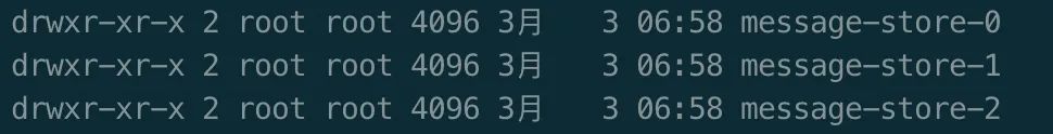 上图给出了三个目录,代表Topic名称为message-store的三个分区,三个目录下面分别存储了三个分区的数据文件,从目录可以看出,分区目录的创建规则是TopicName-分区编号。下面我们挑选0分区,看一下下面存储了哪些文件。
