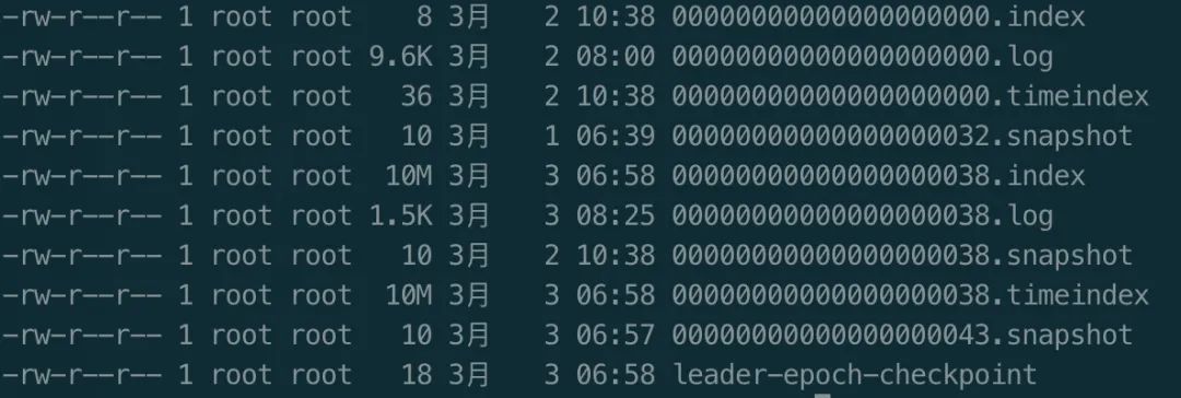 日志文件有很多后缀,如上图所述有.index、.log、.snapshot、.timeindex