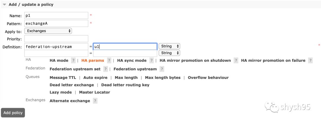 在配置完了Federation Upstreams之后,再定义一个Policy用于匹配交换器exchangeA,并且使用刚才的Federation Upstreams配置,如下图: