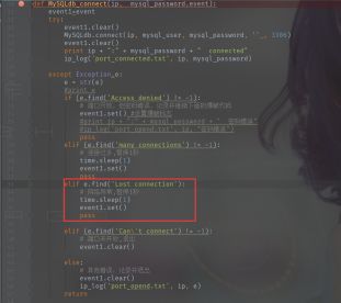 于是直接删去ping功能,直接调用mysql函数连接3306端口,通过设置join()的超时设置来判断端口是否开放。因为一般情况下,若mysql服务端口3306端口不开放,返回不能连接的错误需要6~8秒左右,但若该端口开放,1秒便能回应。因此设置join(3),若3秒内无回应,则默认端口关闭,销毁该线程。这样改进以后,线程能开到10000左右,效率翻倍提高,代码也更加简洁。