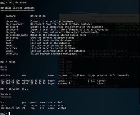现在我们可以将信息导入和导出到我们的数据库,我们来看看我们如何在msfconsole中使用这些信息。 许多命令可用于搜索存储在我们的数据库中的特定信息。 主机名称,地址,发现的服务等。甚至可以使用结果数据填充模块设置,如RHOSTS。 我们稍后会看看这是如何完成的。