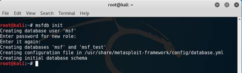 启动postgresql之后,需要使用msfdb init命令创建和初始化msf数据库。Metasploit自带的msfdb命令脚本可以完成Metasploit与postgresql数据库的交互,输入msfdb -h可以查看更多功能。