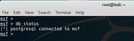 启动msfconsole后,运行db_status可以确认Metasploit成功连接到数据库