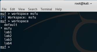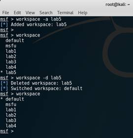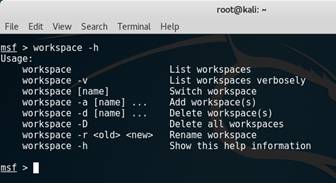 创建和删除工作区只需在msfconsole命令提示符下使用“-a”或“-d”,后跟工作区名称,创建新的工作区后,会自动切换成当前工作区。如果删除的工作区是当前工作区,则自动切换到default工作区。