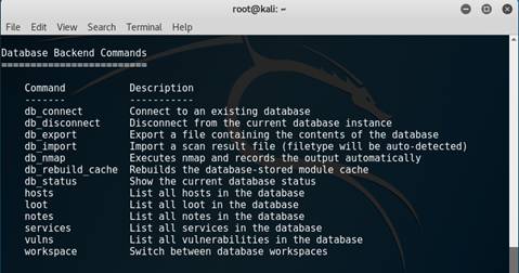 现在我们已经连接到数据库,并设置了工作区,下面我们使用一些数据填充它。首先,我们将使用msfconsole的“help”命令查看可用的不同“db_”命令。