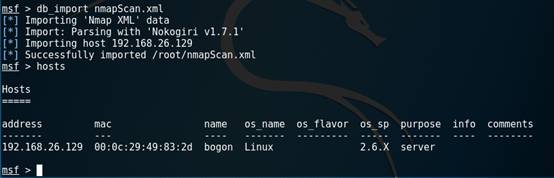 有几种方式实现导入和扫描,包括从控制台直接扫描主机或网络,或从早期扫描导入文件。我们从导入“metasploitable 2”主机的nmap扫描结果开始。通过使用'db_import'后跟结果文件的路径完成导入。