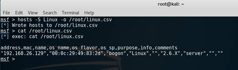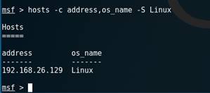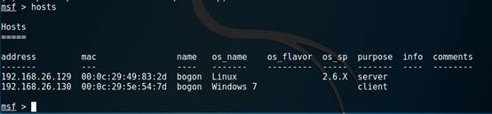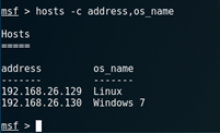 一旦完成,我们可以通过发出'hosts'命令确认导入。 这将显示我们当前工作区中存储的所有主机。 我们还可以使用'db_nmap'命令直接从控制台扫描主机。 扫描结果将保存在我们当前的数据库中。 该命令的工作方式与“nmap”的命令行版本相同。