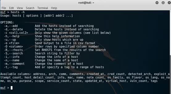 前面我们使用'hosts'命令来确认数据库中是否存在数据。 我们来看看不同的可以选项,看看如何使用它来为我们提供快速有用的信息。 用'-h'发出命令将显示帮助菜单。