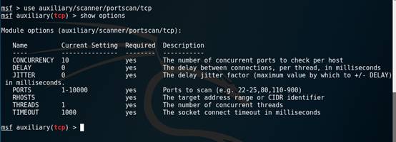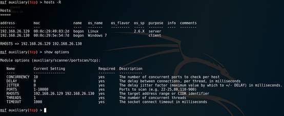 使用我们前面的例子的输出,我们将它提供给'tcp'扫描辅助模块。