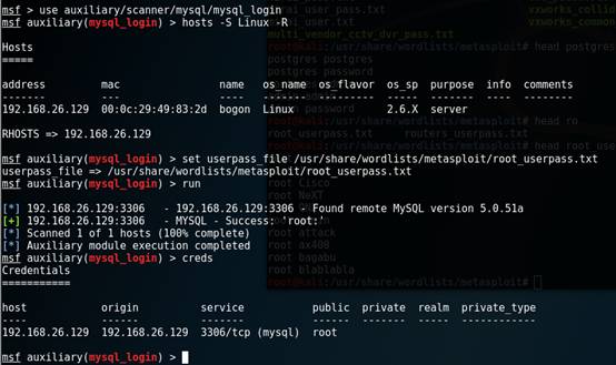 可以看到,mysql_login模块可以登录mysql服务器,由于此,Metasploit自动保存该凭据到数据库中,以备将来使用。