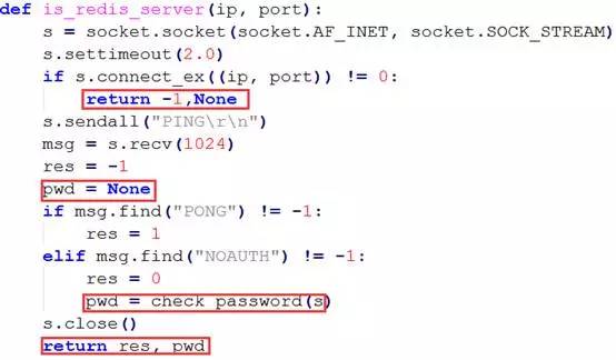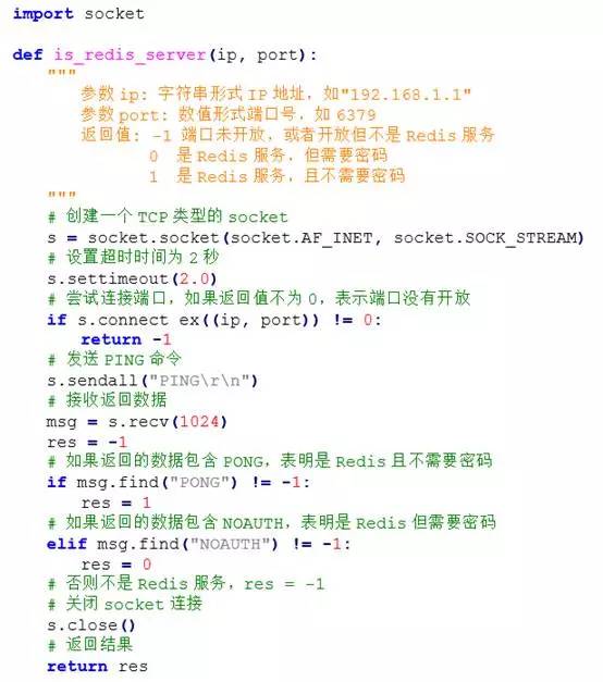 代码封装在is_redis_server函数中,传入参数为IP地址以及端口号,返回-1表明端口未开放或者开放但不是Redis服务,返回0表明是Redis服务但是需要访问密码;返回1表明是Redis服务且不需要访问密码。