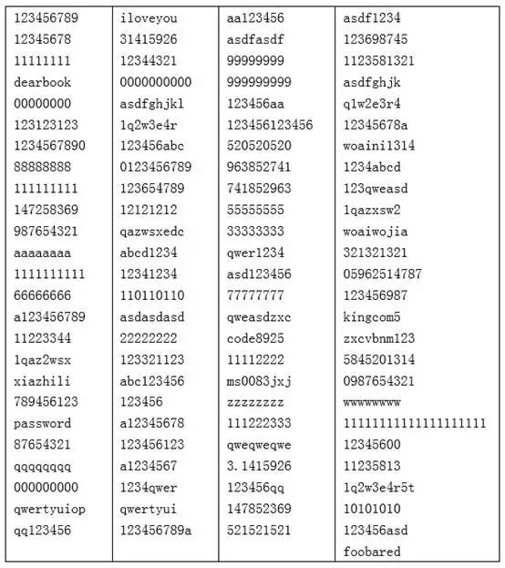 实现弱口令爆破的思路很简单,我们不断的往Redis服务器发送AUTH命令即可,如果返回结果包含字符串invalid password,表明密码错误,如果返回结果包含字符串OK,则表明密码正确。那么弱口令字典哪里来呢?这里我们以CSDN泄露的数据库中最常用的100个密码建立一个弱口令字典(来自文章http://coolshell.cn/articles/6193.html),弱口令列表如下图所示(字典文件位于实验主机C:\Code\Redis\dict.txt,当然,这里必须加入Redis默认的密码foobared,为了测试效果将其放在了最后一行,实际为了提高命中率可以放在第一行):