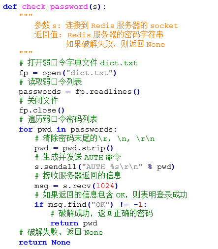 我们将爆破密码的代码封装在check_password函数中,函数首先读取dict.txt文件的密码列表,随后遍历列表中的密码并生成AUTH命令,将生成的AUTH命令发送到服务器,根据服务器的返回信息判断密码是否正确:如果返回的信息包含OK则表明密码正确。具体的代码如下图所示:
