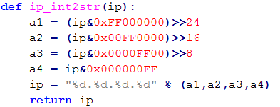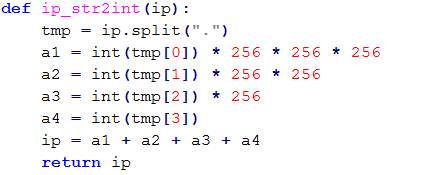 3.3.1. 将字符串形式的点分十进制IP地址转换为数值,首先使用split将IP地址进行分离,比如"10.1.1.47".split("."),这样各个点之间的数据就分离了,得到列表["10", "1", "1", "47"],随后将列表中 的元素从字符串转换为int,并乘以相应的系数后累加,代码如下: