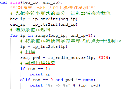 网段范围扫描的代码封装在scan函数中,其中beg_ip通过sys.argv[1]获取,end_ip通过sys.argv[2]获取,具体的代码如下所示: