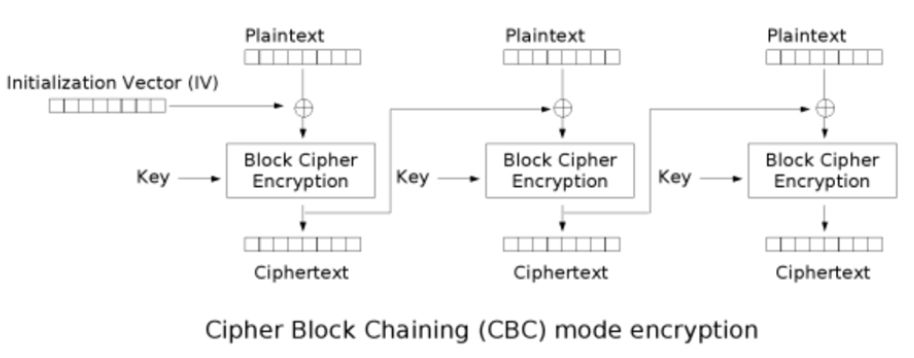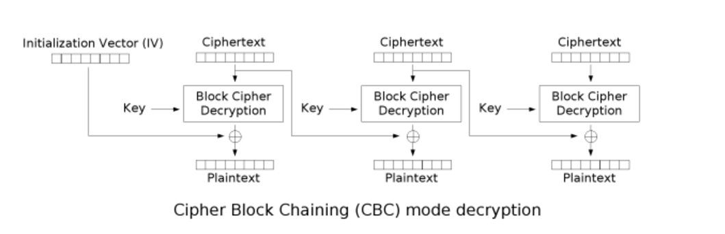 从图中我们可以看出CBC是分组加密的,每一组先与一个初始向量IV进行异或(异或:A异或B得C,C异或B得A),异或得到的值我们称之为中间值(IMV),再用KEY对中间值进行加密得到了第一组密文。第一组密文再作为IV与第二组明文进行异或得到第二个中间值,同样也是用Key将这个中间值加密后得到第二组密文,以此类推。看到这里其实我们可以思考一个问题,最后一组明文其实是经过填充的,这是它与其余几组的不同之处,那么是否意味着我们可以在这个地方有什么利用呢?