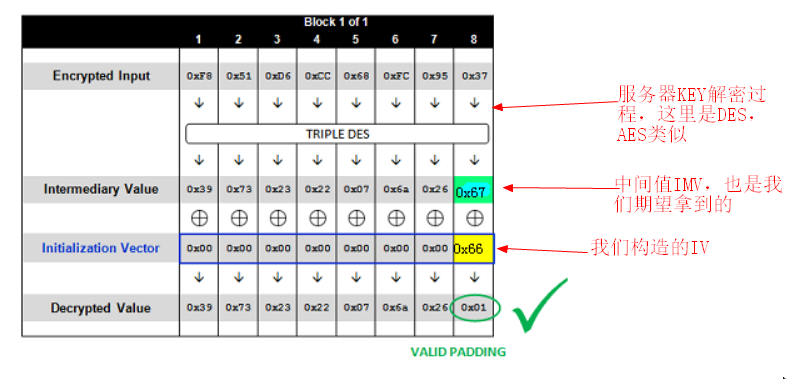 整理下思路,现在我们可以捕获到密文,并且知道了加密算法也知道初始向量IV,在对密文进行分组后,只要我们有办法绕过KEY解密的过程拿到中间值是不是就能直接用中间值(IMV)与初始向量IV进行异或操作从而拿到所有的明文。