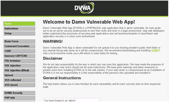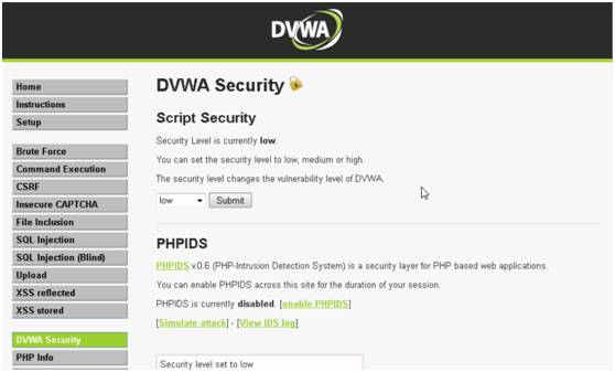 在左下角的DVWA Security可以调节难度系数,即low,medium,high,impossible选中后点击submit提交即可。