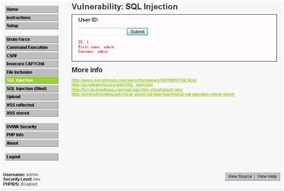 Low级别的代码对来自客户端的参数id没有进行任何的检查与过滤,存在明显的SQL注入。