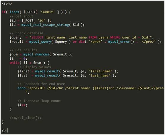 Medium级别的代码利用mysql_real_escape_string函数对特殊符号\x00,\n,\r,\,’,”,\x1a进行转义,在一定程度上控制了用户的输入