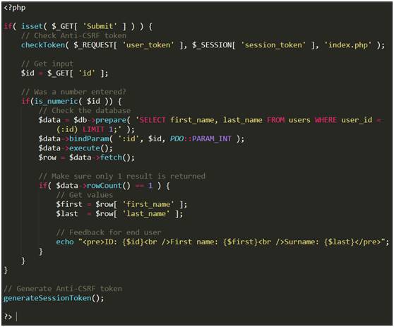 代码中限制返回的查询结果数量为一时,才会输出,防止了大量数据的泄露,同时采用了PDO技术,隔离了代码与数据,使得用户输入的数据不再被当作代码执行,采用这种方案,杜绝了SQL注入漏洞的发生