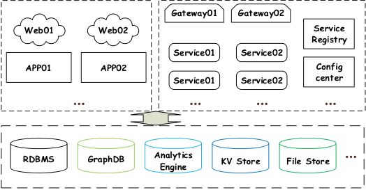 多个分布式架构的系统,组成分布式系统群,就形成了一个相对复杂的分布式架构环境。通常包含多种上层应用服务,多种底层基础计算存储引擎。如下图 1 所示: