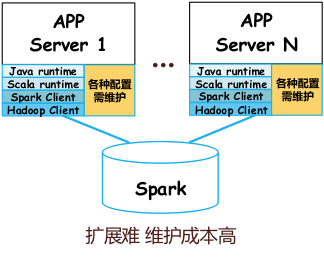 这还仅仅是对接 Spark 一个底层引擎。随着上层应用系统和底层引擎的数量增多,需要维护的关系会是个笛卡尔积式的增长,光 Client 和配置的部署维护,就会成为一件很令人头疼的事情。