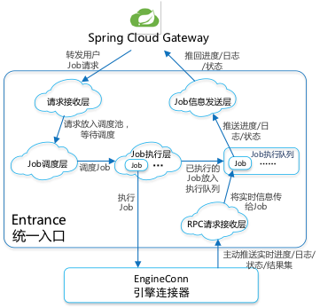 入口服务 Entrance,负责接收作业请求,转发作业请求给对应的 Engine,并实现异步队列、高并发、高可用、多租户隔离。