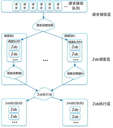 在请求接收层,请求接收队列中,会缓存前端用户提交过来的成千上万计算任务,并按系统/用户层级划分的调度组,分发到下游 Job 调度池中的各个调度队列;到 Job 调度层,多个调度组对应的调度器,会同时消费对应的调度队列,获取 Job 并提交给 Job 执行池进行执行。过程中大量使用了多线程、多级异步调度执行等技术。示意如下图 21: