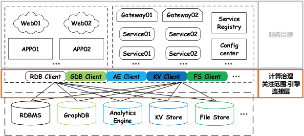 计算治理,关注的正是上层应用和底层计算(存储)引擎之间,从 Client 到 Server 的连接层范围,所存在的紧耦合、灵活性和管控能力欠缺、缺乏复用能力、可扩展性、可维护性差等问题。要让复杂分布式架构环境下各种类型的计算任务,都能更简洁、灵活、有序、可控的提交执行,和成功返回结果。如下图 3 所示: