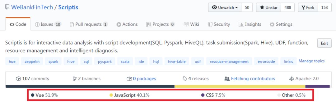 如下图 17,Scriptis 项目 99.5% 的代码,都是前端的 JS、CSS 代码。后台基本完全复用 Linkis。