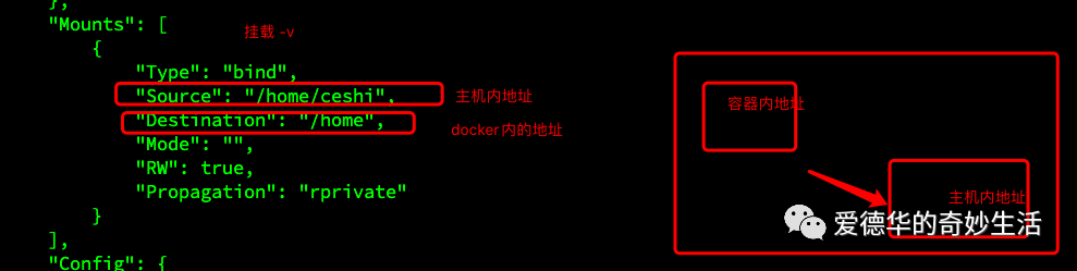 docker run -it -v 主机目录:容器内目录#测试[root@vultr home]# docker run -it -v home/ceshi:/home centos bin/bash#通过docker inspect 容器id 来查看容器信息