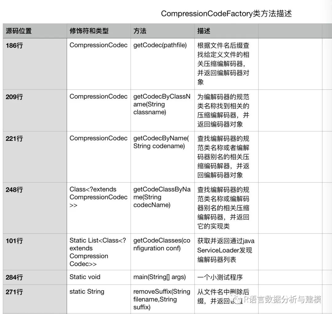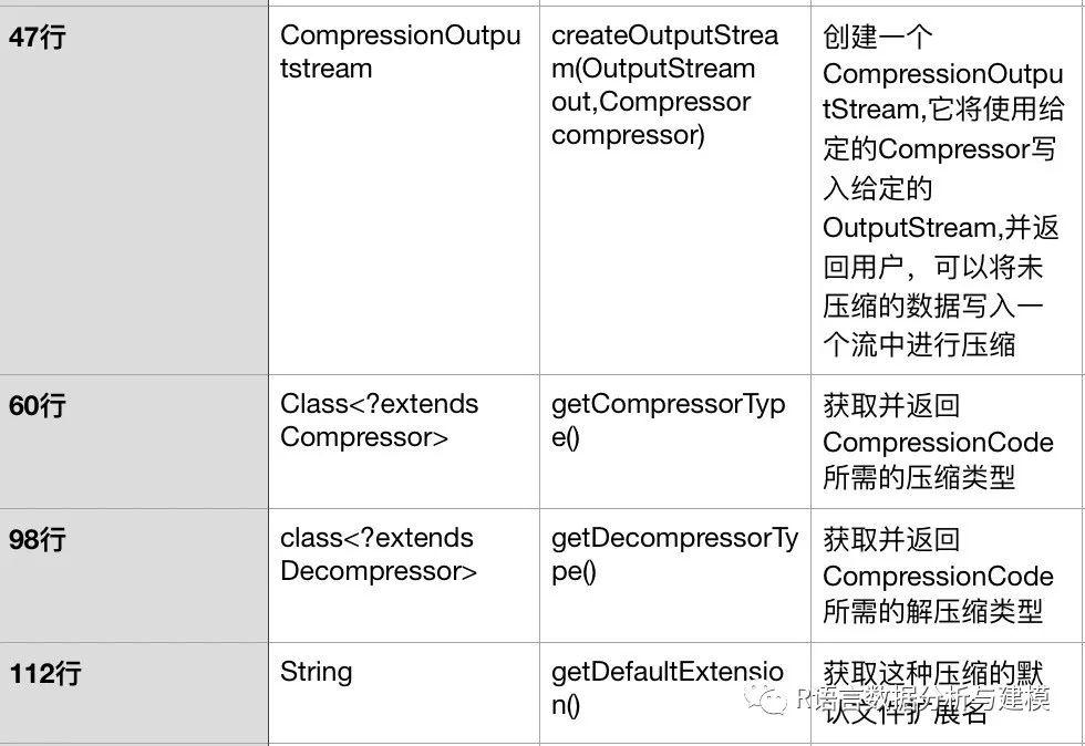 compression codec接口的源码位于“org.apache.hadoop.io.compress.compression codec”中,所有已知的实现类,同时包含很多方法。