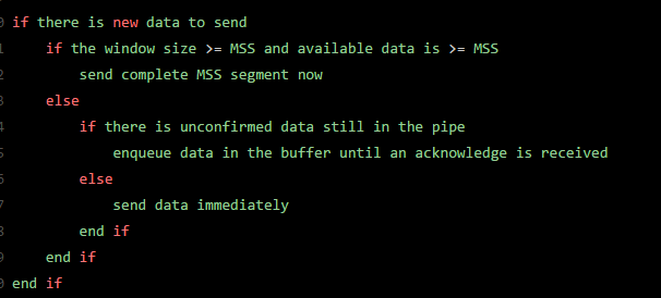 如果收到 ACK, 立即发送缓存的内容。(MSS 为 TCP 数据包每次能够传输的最大数据分段)