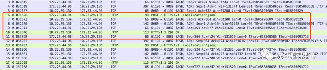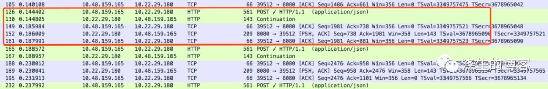 如下图,这是使用 Wireshark 分析包内容的展示,红框内是一个完整的 POST 请求处理过程,看 130 序号和 149 序号之间相差 40ms(0.1859 - 0.1448 = 0.0411s = 41ms)