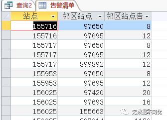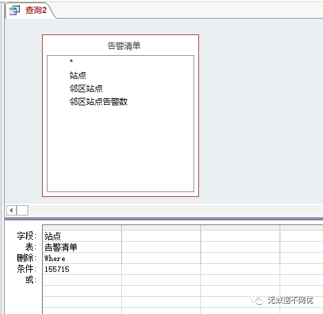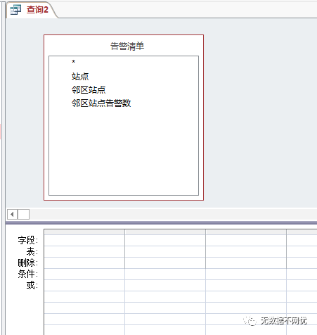 首先依然是创建-查询设计,添加“告警清单”这张表,效果是这样的: