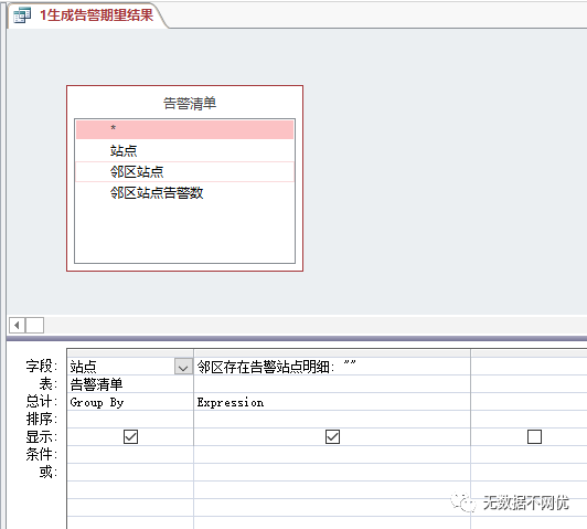 然后修改总计行和字段行如下所示,并保存此查询为“1生成告警期望结果”,执行后你就会发现多了一个名叫“期望结果”的表出来。