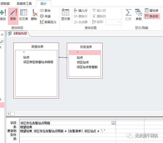 依然创建查询,添加表“期望结果”和“告警清单”,并将站点进行普通联接,并且将查询更改为更新表查询