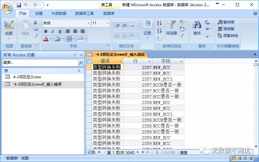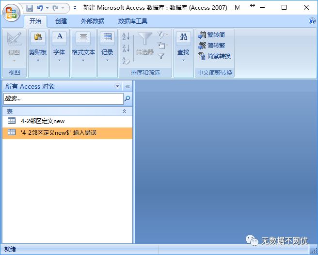 在表视图中选择“外部数据”菜单,导入栏选择Excel,选择包含邻区关系的Excel文件和工作表后将数据导入Access表中,也可以通过在Excel中选中全部数据,在Access表视图中直接粘贴即可自动新建表并将数据复制至表格中。