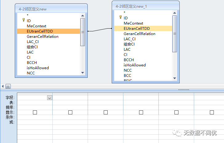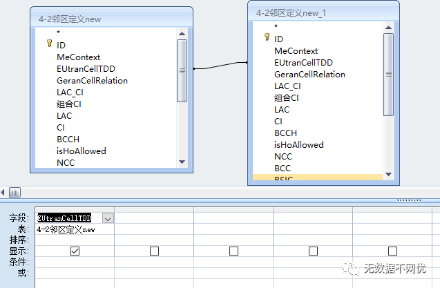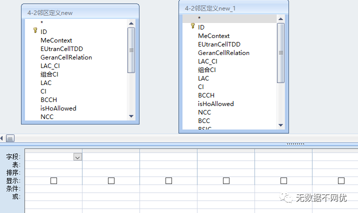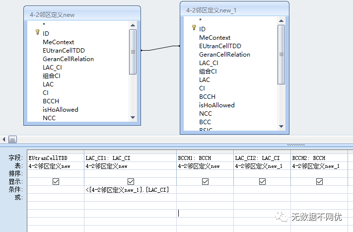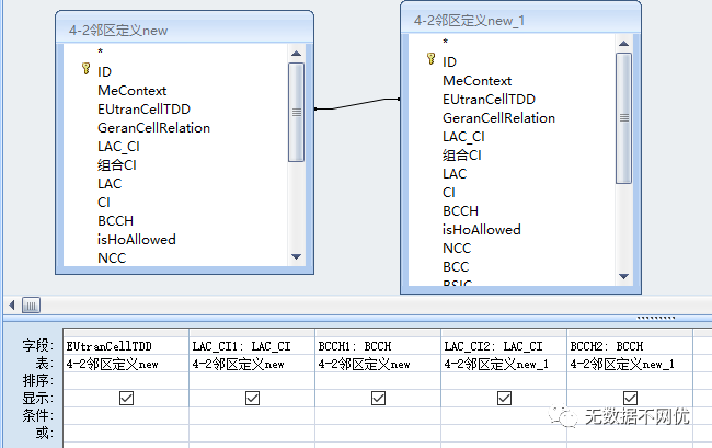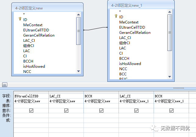 同理双击左侧表格”4-2邻区定义new”中的 LAC_CI字段,BCCH字段,右侧表格”4-2邻区定义new_1”中的 LAC_CI字段,BCCH字段,效果如下: