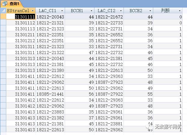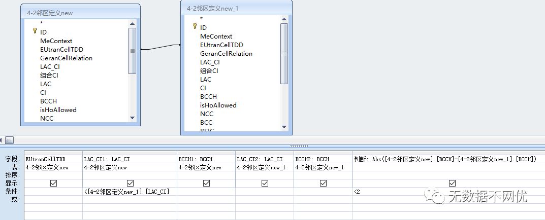由于4G小区的两个2G邻区一个在前一个在后,在查询结果中会出现两次,所以我们需要做个条件,让”4-2邻区定义new”中的 LAC_CI小于”4-2邻区定义new_1”中的 LAC_CI,这样同样的小区不会去同邻频比较,不同的小区也不会A与B比一次,B与A再比一次,而是只会A与B比一次。