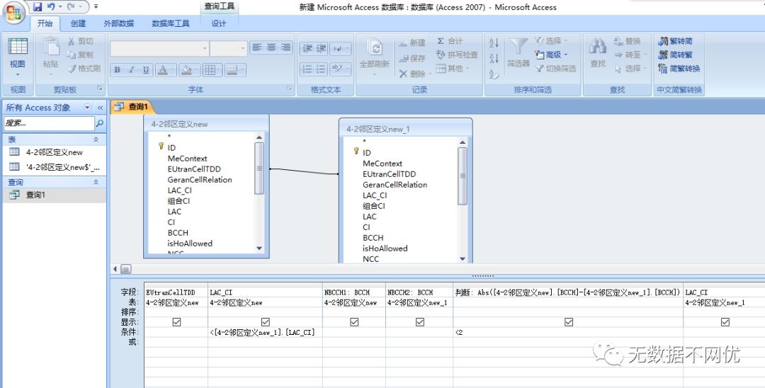 如何在Access中通过建立查询,识别出一个4G小区的2G邻区同频和邻频。