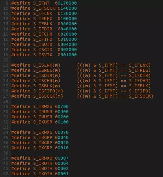图3中的宏定义就是Linux内核中对文件权限属性的宏定义,例如S_IRUSR表示主权限可读的标示。这里需要理解的是每个标示占用一个位,本文暂时不过多介绍,这里先有个概念就可以了。