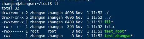 这些旗标可以通过或的方式进行组合,从而创建具有期望访问权限的文件。文件的UG属性则是继承自进程的用户和组。例如我们通过一个小程序实现创建文件的功能,当分别用root用户和zhangsn用户创建文件时,得到文件的属性如下所示。