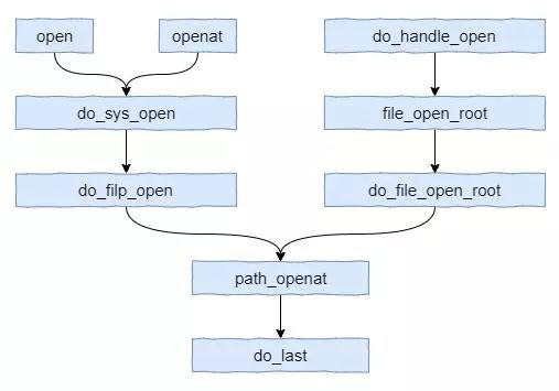 对于操作系统的API来说,打开文件的整个流程如图所示。最终do_last函数会调用到一个名为may_open的函数,而该函数则调用inode_permission函数。该函数实现了具体的权限检测功能。