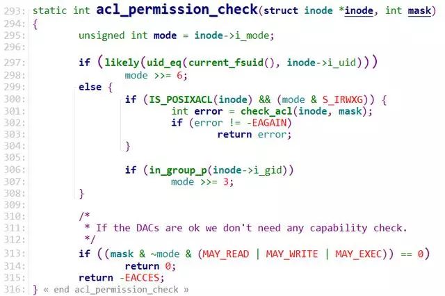 基本的权限检查是在acl_permission_check函数中完成的,整个调用过程为inode_permission->do_inode_permission->generic_permission->acl_permission_check。