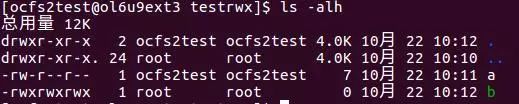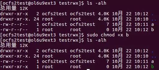 执行后结果如图4所示,可以对比图中上下两部分,看到文件b的权限熟悉发生了变化。其中增加了可执行属性。